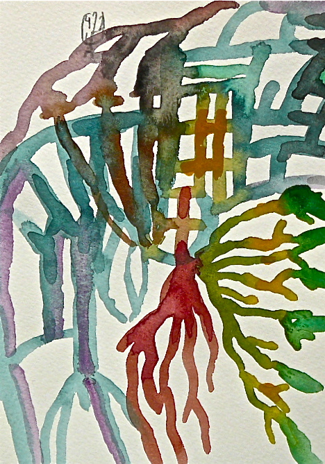When it was finished I let it rest for a while. A day later I looked at it and collected words that just came to me as I was looking. The waiting is not necessary. You can do it immediately after you finish the drawing. I did not try to think or organize the words. I just made a list, as if I was finding them along some road. Here are the words that I collected: