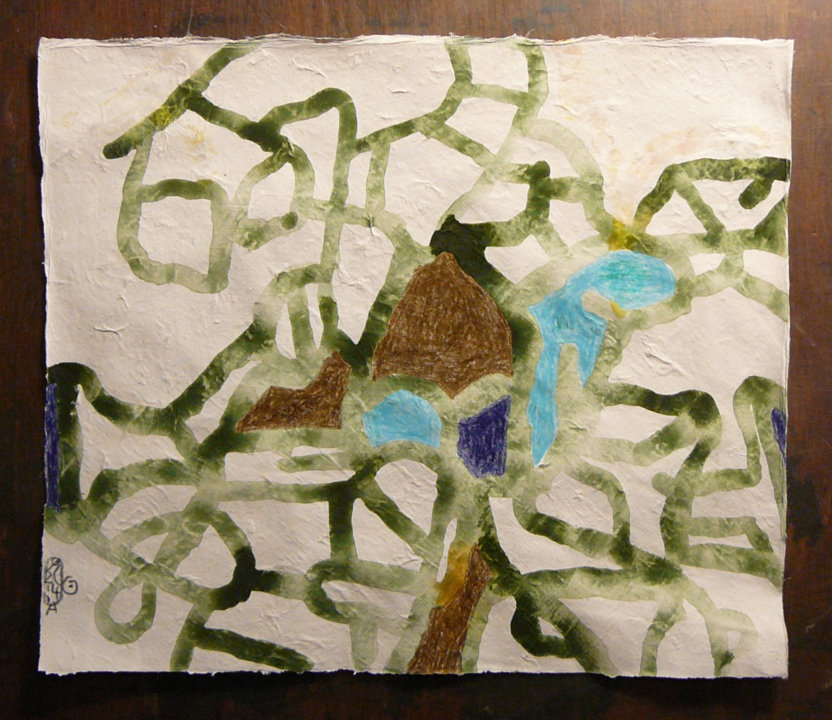 There are two places where the colors that were used are dark and contrast strongly with their immediate environment. One is in the blue that is darker than all the other areas of color and contrasts strongly with the red lines that are touching it. It could have been an opening to the sky and a window to escape through, but the restlessness of the texture is pretty deterring and the strong red lines all around it make it feel dangerous to pass through. So there is no escape.