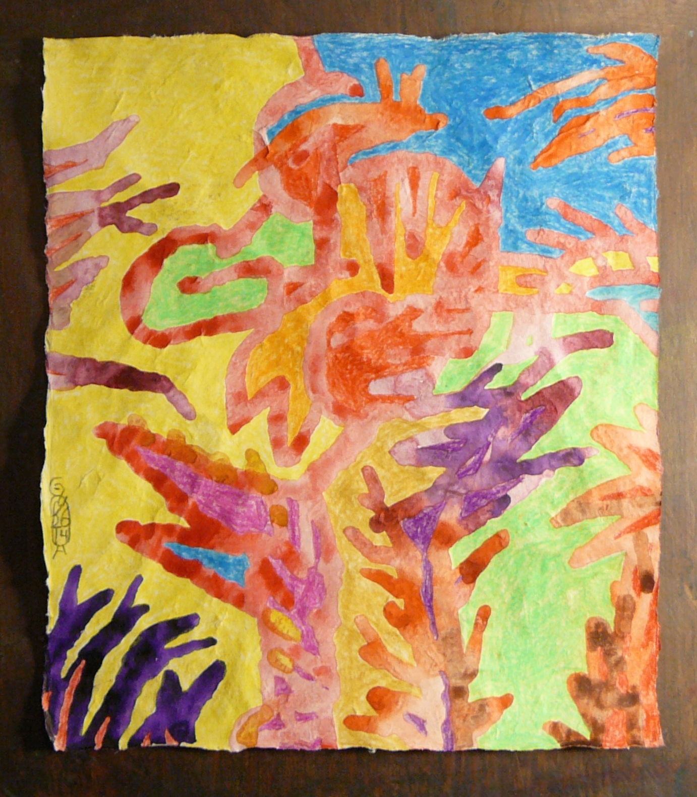 In the stage in which it was a drawing only, it expressed the craziness and strength of the pain quite effectively. When I added the colors the effect became somewhat weaker. The power of lines to affect the areas that they point at, was hindered by the viscosity of the colors and also by the effect of the colors. A body of color has an effect of its own and when you place different areas of color next to each other they influence each other and create yet another effect. All these added effects weaken, relatively, the effect that the lines had when they did not compete with the colors. Nevertheless, you can still see the craziness of the pain, the way it spreads in all contradicting directions. This contradiction creates a feeling of struggle and chaos. The chosen colors also cry out from the page. They radiate energy that refuses to settle. This adds to the expression of the power of the pain and the chaos. When you hold this picture in your hands you want to drop it or put it quickly in a box and cover it with a black cloth, to stop that radiation and protruding thorns.
