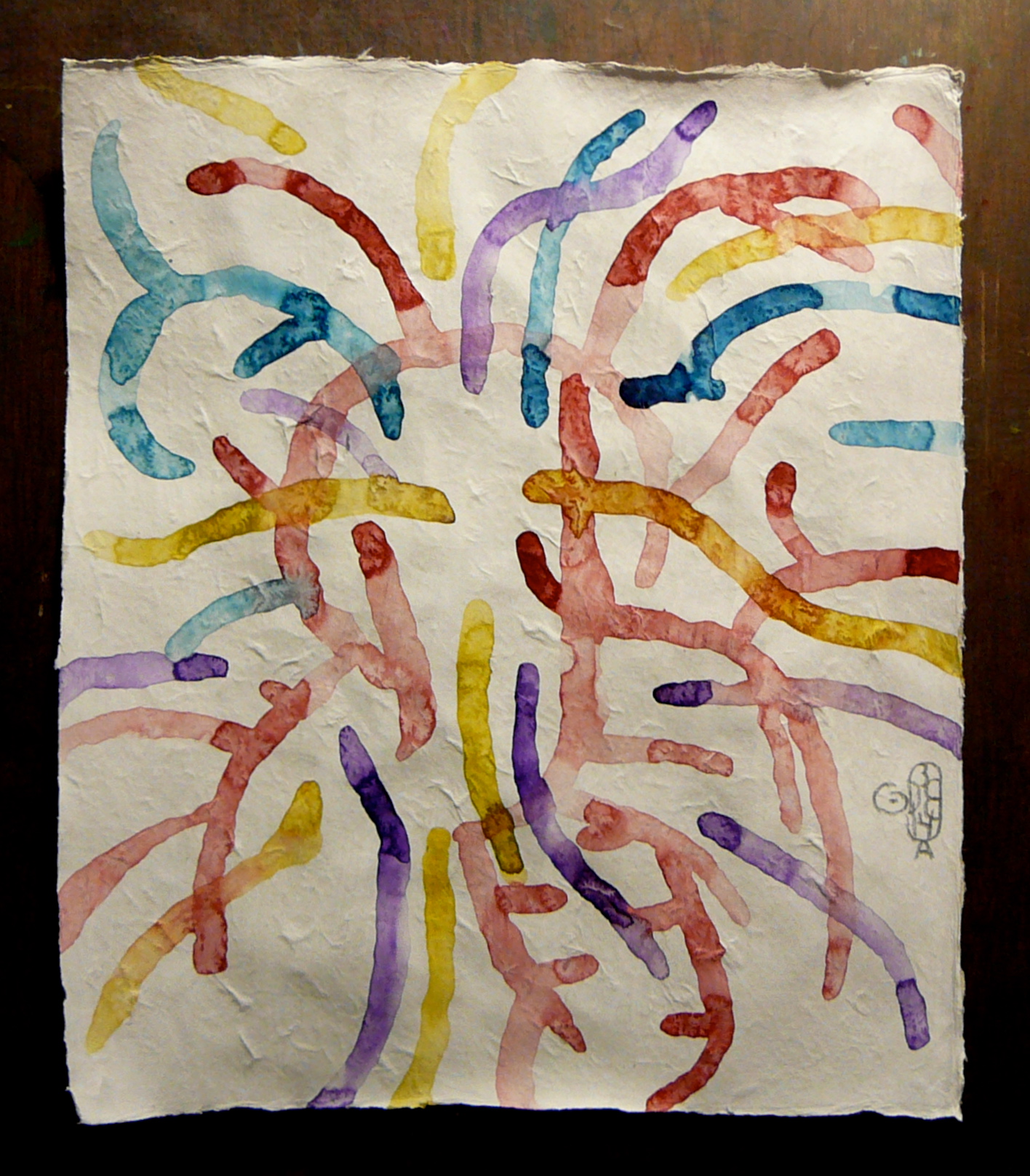 In my imagination it looked different at first. It looked like a scene into which you could penetrate deeper and deeper, passing bodies of something on the way, going beyond them, passing other bodies, and so on. Here I have some form in the middle, as if it is a three dimensional form. You may get the feeling that it is a kind of a giant. You are looking from the level of the knees and far ahead there is the head. Then it may even look as if this head is looking down at you. As much as I wanted to lose my earthly perspective, it came through. I could not get rid of it. In a way it endears this perspective to me. Like a child that you, impatiently, want to convince to do something that is more comfortable for you to deal with, but the child stubbornly wants to go at that thing from his perspective. At first you get annoyed, but you end up listening. If he insists so strongly, you think, let me listen carefully, because there is something in it for him, and it is important for him so much that he opposes me. Let me see what it is.