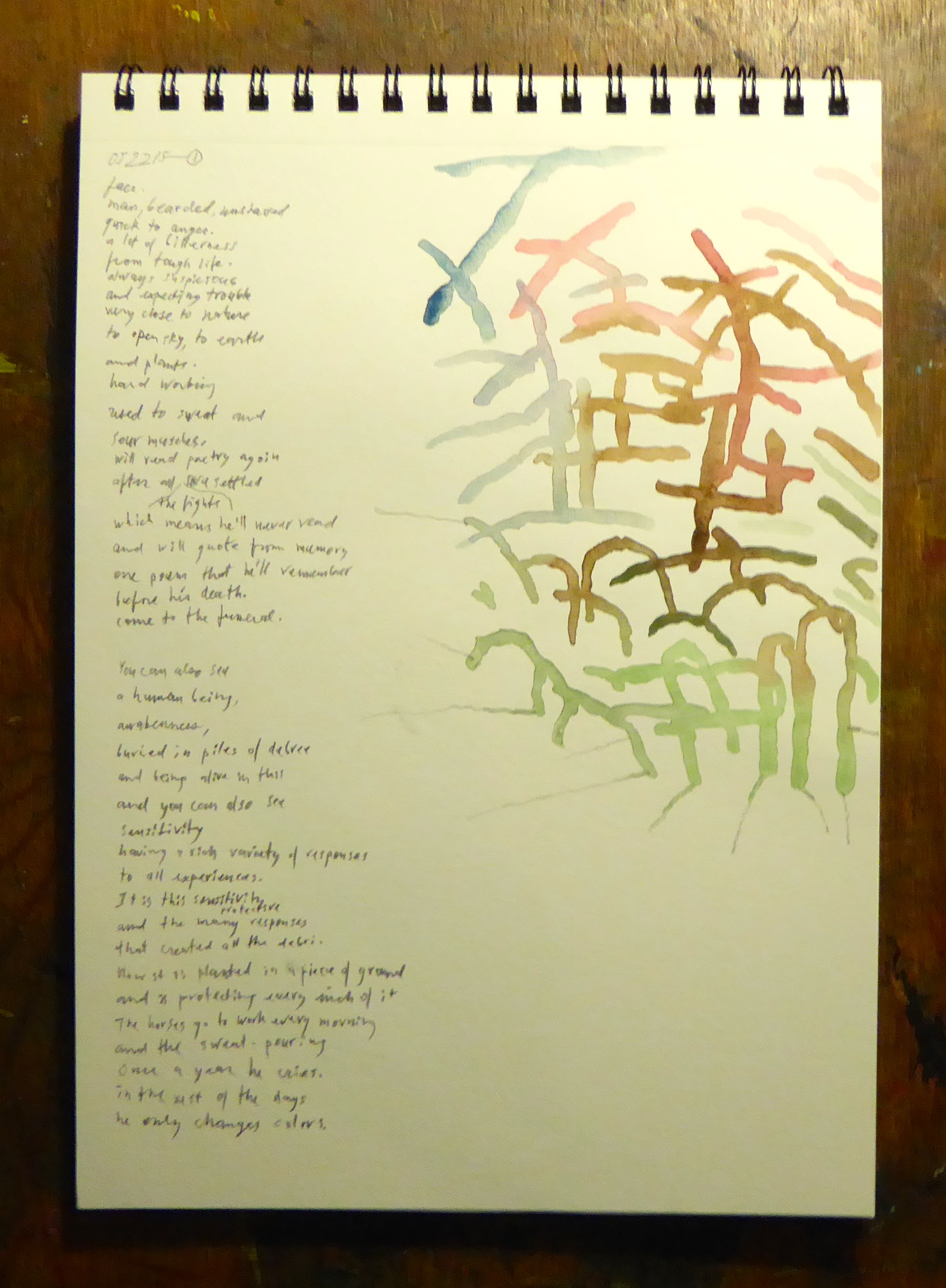 You can also see a human being who is awake and buried in piles of debris. You can see his sensitivity showing from under the piles. He has a rich variety of responses to all experiences. It is this sensitivity and the many protective responses that created the debris. Now he is planted in a piece of land and protecting every inch of it. The horses go to work every morning, the sweat is pouring. Once a year he cries. In the rest of the days he only changes colors.