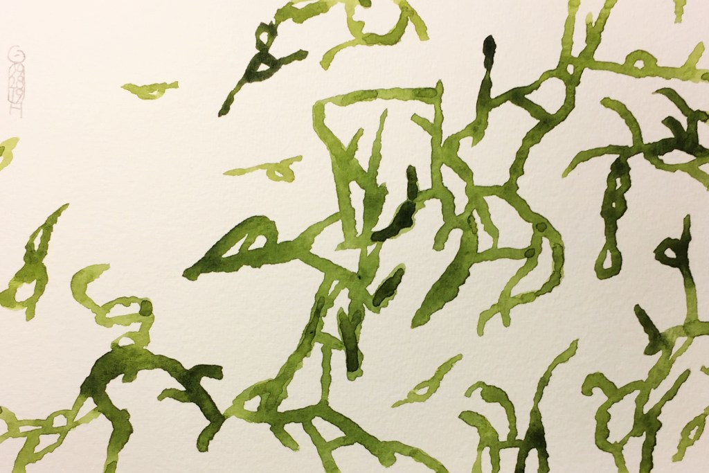 As in many times before, many shapes that I drew, not knowing what I was doing, ended up looking like strange animals. I did not think of any birds and no people were planned. But now there is a man in the left lower corner, doing something and maybe using a second head to look at the biggest falling bird. Maybe it is falling right on him? On the right there is a bra hanging from a tree branch. It seems there is some ground at the bottom. It is not drawn. But several things stand on it. This is why, for me, it feels that an earth must be there. At the top there is a big bird feeding a young, smaller bird, while in flight, as airplanes sometimes do. maybe there is a cat down on the earth, with some unknown creature standing on its back. So what is behind what I draw here? I somewhat like this drawing. I did not add paint to it, to preserve it as it is, in the most alive state, before the power of the colors reduces its strength. Being raw, you can feel the fascination with the shimmering of everything. This is how I see things nowadays. It is not a perfect drawing. The hanging bra and one little bird, alone in the air, at the top left, break the diagonal flow of everything else. The little bird moves at least. But the bra is defying every tendency in the drawing, by hanging vertically, as if nothing is happening around it.