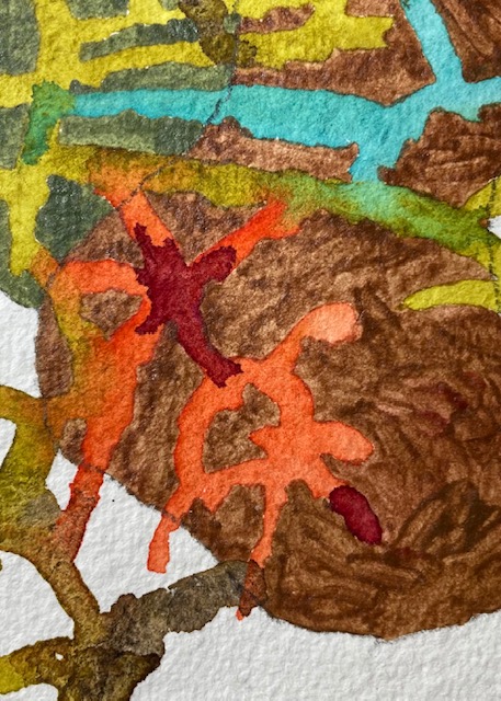 These two spots relate to each other in their colors, textures and the feeling of having interruptions in them. I could call it spottiness. Please look at them in the big picture, in the previous entry. In the head, the spots look like a decoration. In the pain area the feeling is of a bleeding in a weak system.