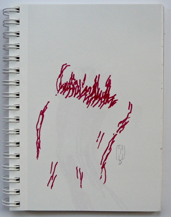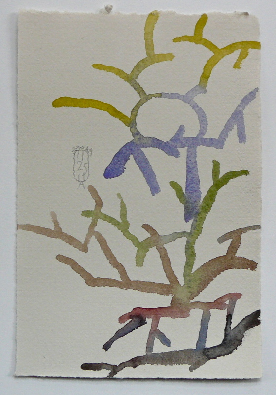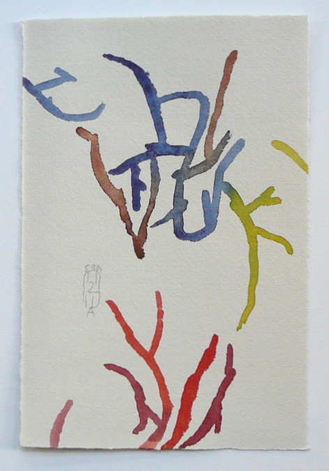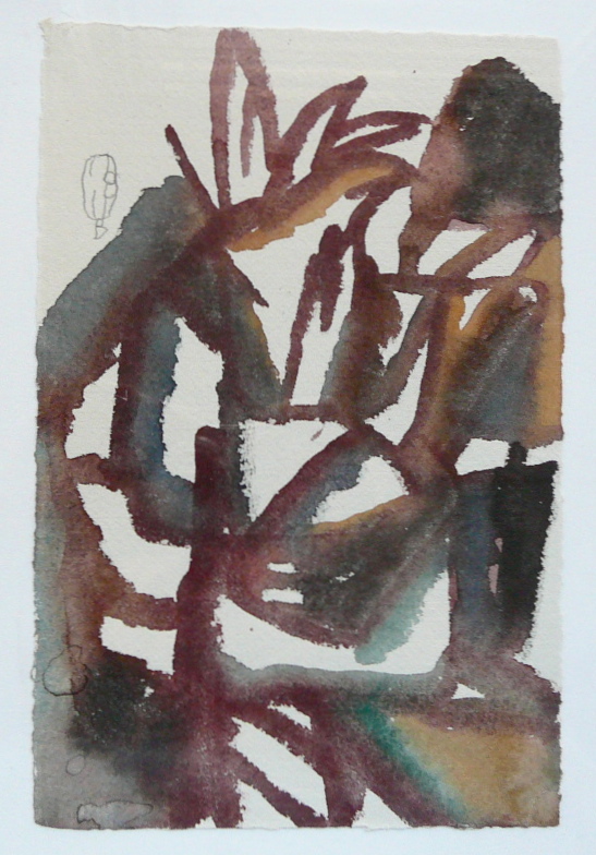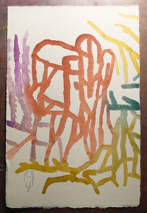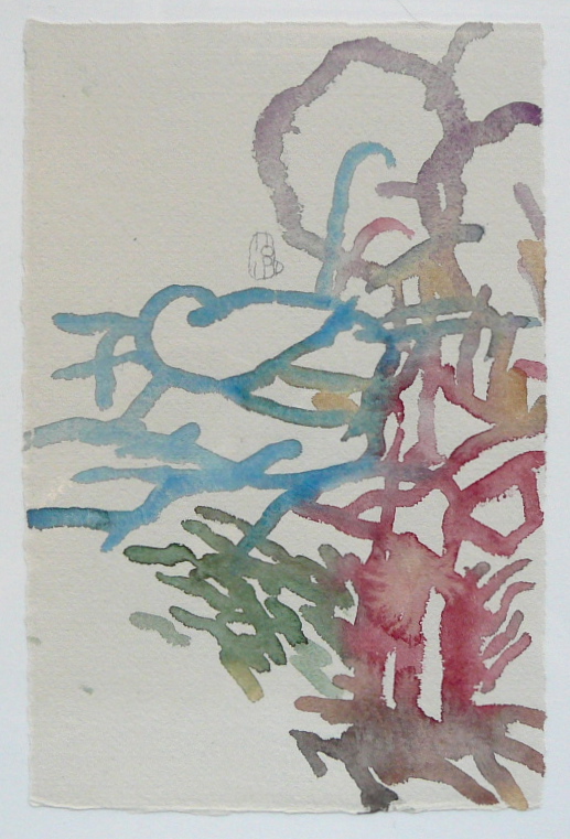 So I decided to show you the little pain drawings that are different from all the pain drawings from the past. There is almost no composition in them. There are eight in the first night and four in the second night, but I’ll only show a few. And then, one of the morning watercolors and its going-in-with-words. Take this as a report from the road, where I do not yet know where I am, I do not see where I am going, but in spite of the strong and unbearable pain, somehow everything is OK. I can’t walk, I can’t sleep, I can’t sit and yet I do all these, shaking uncontrollably again and again. Somehow it feels right. Not from the point of view of guilt and having to be punished. This feeling has almost completely gone by now.