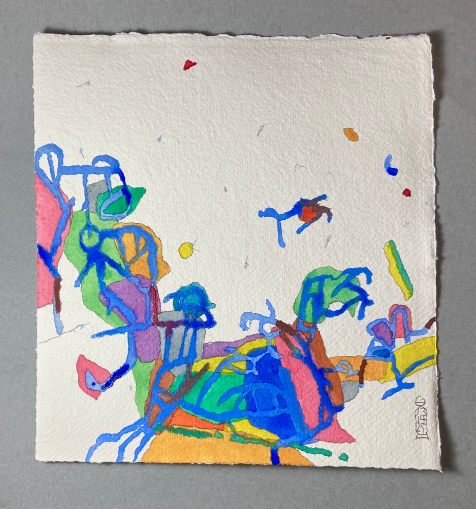The color shapes give a feeling of dancing. But if you look closely at the character of the drawing lines, you’ll see that they have the energy of wanting to grab something, they struggle and they feel lost and hopeless.